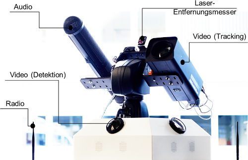 | • | PTZ: Realisiert ist ein Pan-Tilt-System inkl. angeflanschtem Laserentfernungsmesser und Zoomkamera zur Verfolgung der detektierten Objekte. |