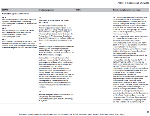 Bei der Auseinandersetzung mit den Regelungen der Datenschutzgrundverordnung (DSGVO) und des Bundesdatenschutzgesetz (BDSG) wird schnell deutlich, dass sie in ihrer Struktur und Systematik sehr unübersichtlich sind. Dieser Beitrag macht die Texte für die Praxis verständlich. Hierzu listet er die Gesetzestexte aller 99 Artikel der DSGVO tabellarisch auf und ordnet ihnen die entsprechenden Erwägungsgründe zu. In einer weiteren Spalte zeigt er, welche Regelungen im BDSG (die seit Mai 2018 gültige Fassung) mit dem jeweiligen Artikel der DSGVO korrespondieren. Eine vierte Spalte liefert eine verständlichen Zusammenfassung und erläuternde Kommentierung des Artikels und der korrespondierenden Regelungen des BDSG.